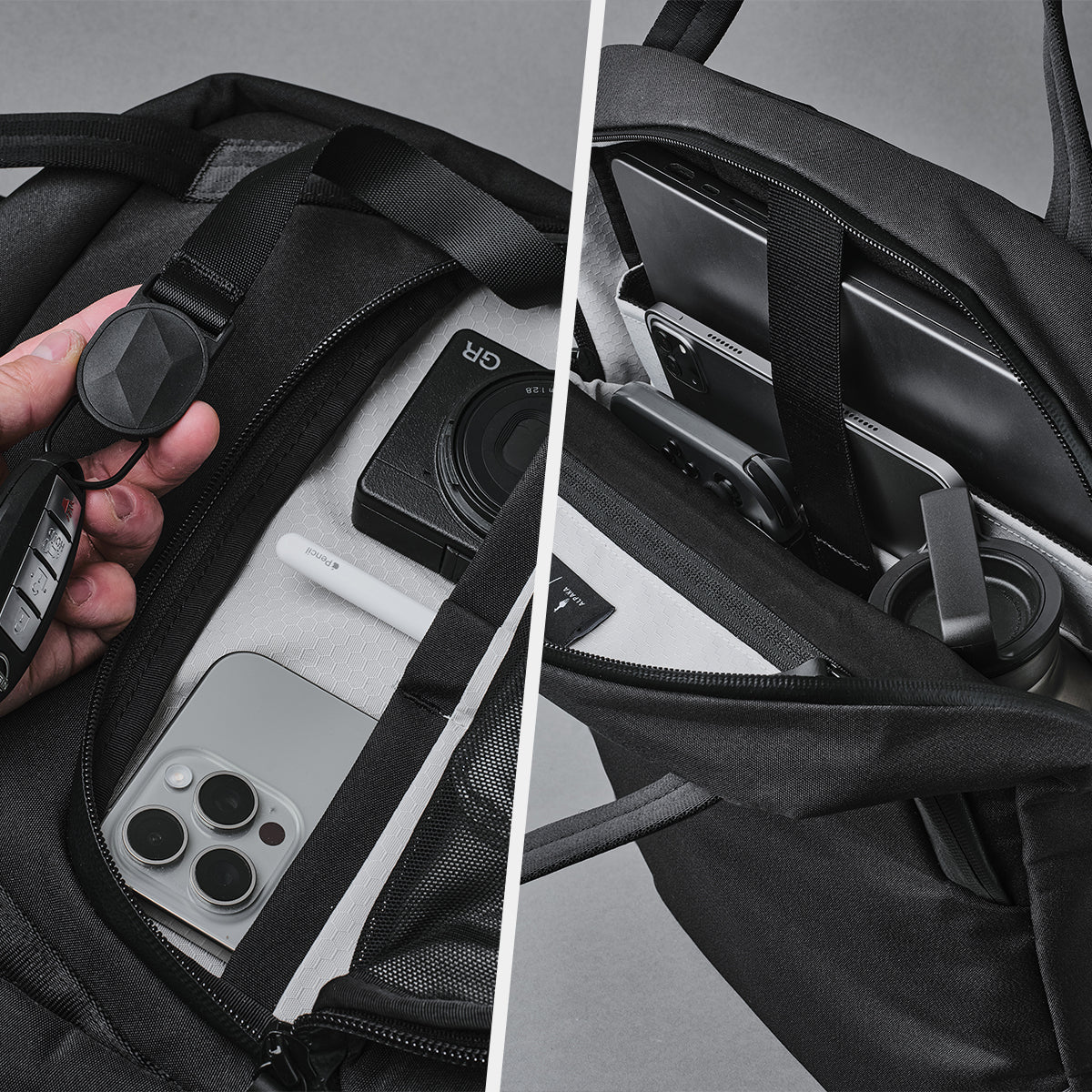 Become the embodiment of style as you navigate the urbanscapes with this convertible totepack (tote + backpack). Effortlessly carry it by hand or transform it into a backpack by attaching the concealed backpack straps. The totepack is meticulously crafted using our Axoflux recycled fabric, ensuring optimal protection for your essentials while remaining eco-friendly.