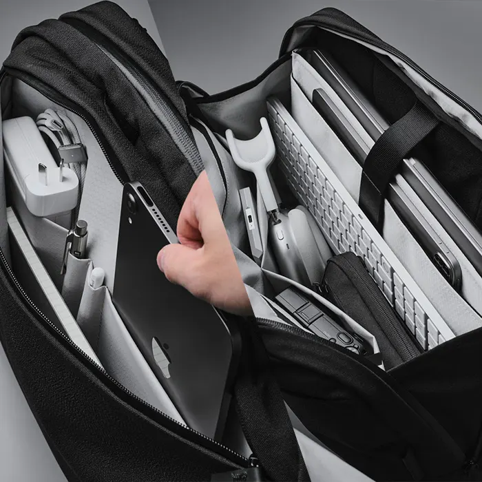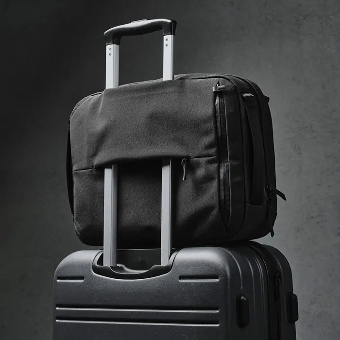 Unzip the rear luggage pass-through to attach it to your luggage to have your essentials at arm's length for the airport rush.