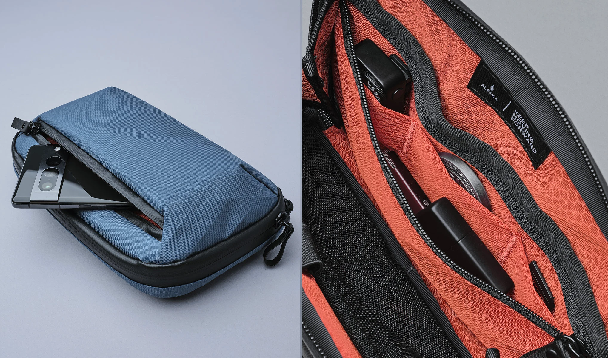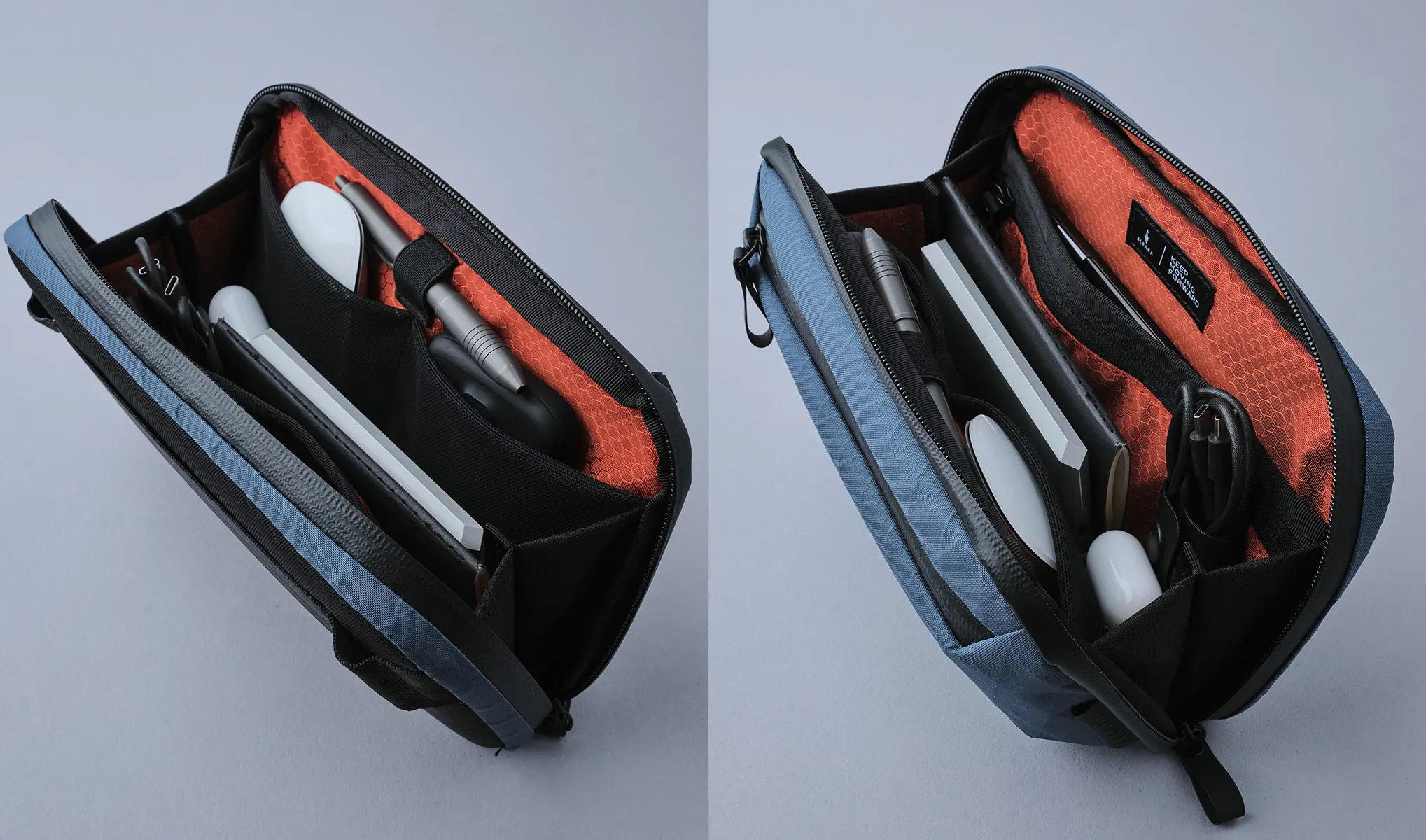 A slim tech case with tons of organization. It has multiple pockets to keep your gadgets neatly stored as well as a zippered front pocket perfect for stowing away loose items like keys or cables.