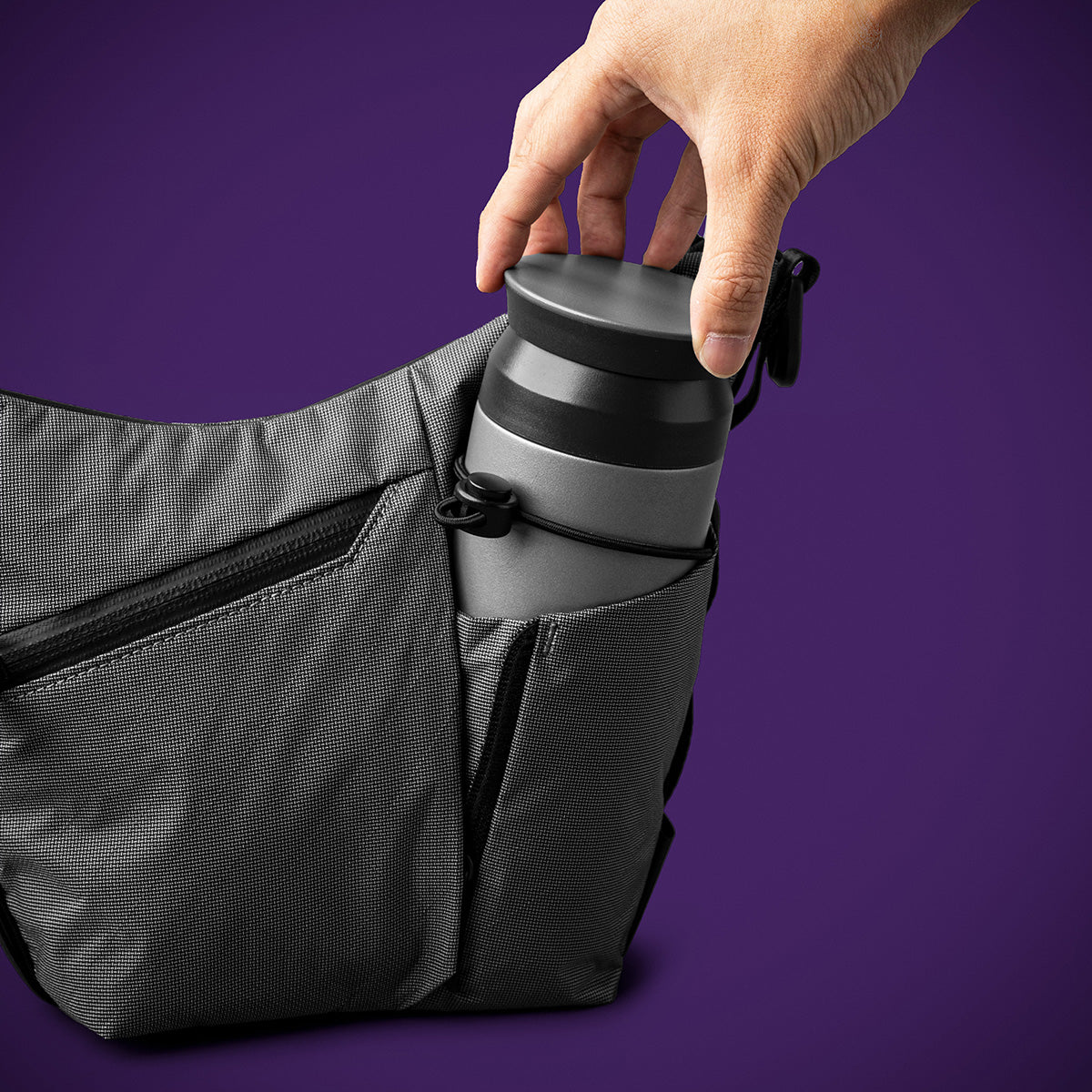 The expandable bottle sleeve accommodates containers up to 500ml, with an elastic cord that secures your bottle as you navigate your day.